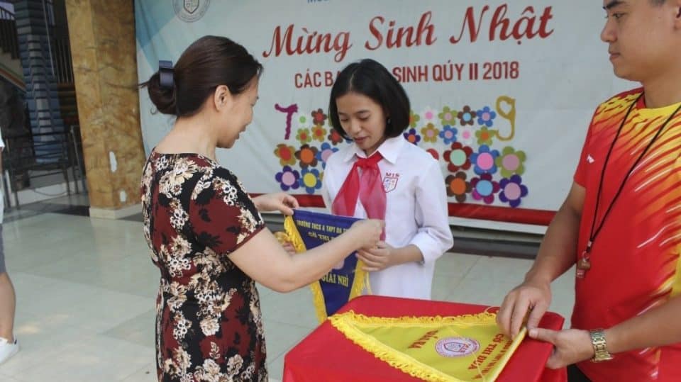 Hiệu trưởng Nguyễn Thị Minh Châu lên trao cờ thi đua cho các tập thể lớp THCS & THPT