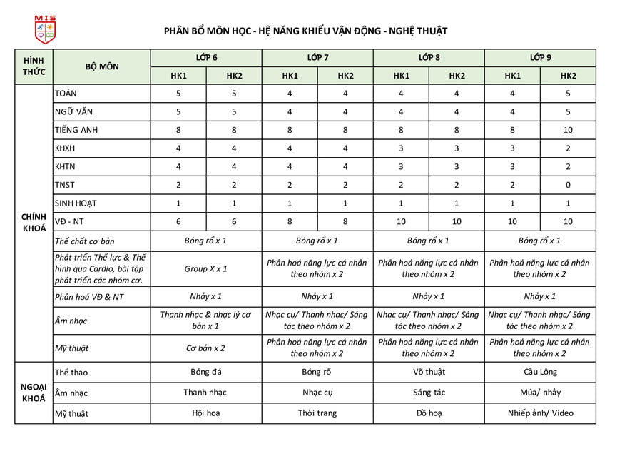 Hệ năng khiếu Vận động – Nghệ thuật tại MIS, song song với việc đào tạo, kích hoạt tư duy, phát triển trí thông minh Toán học, logic (1) và Ngôn ngữ (2) thông qua các môn Khoa học tự nhiên, Khoa học xã hội và đặc biệt với 8 tiết Tiếng Anh/ tuần sẽ giúp các con có một nền tảng kiến thức vững vàng trong môi trường hội nhập Quốc tế.