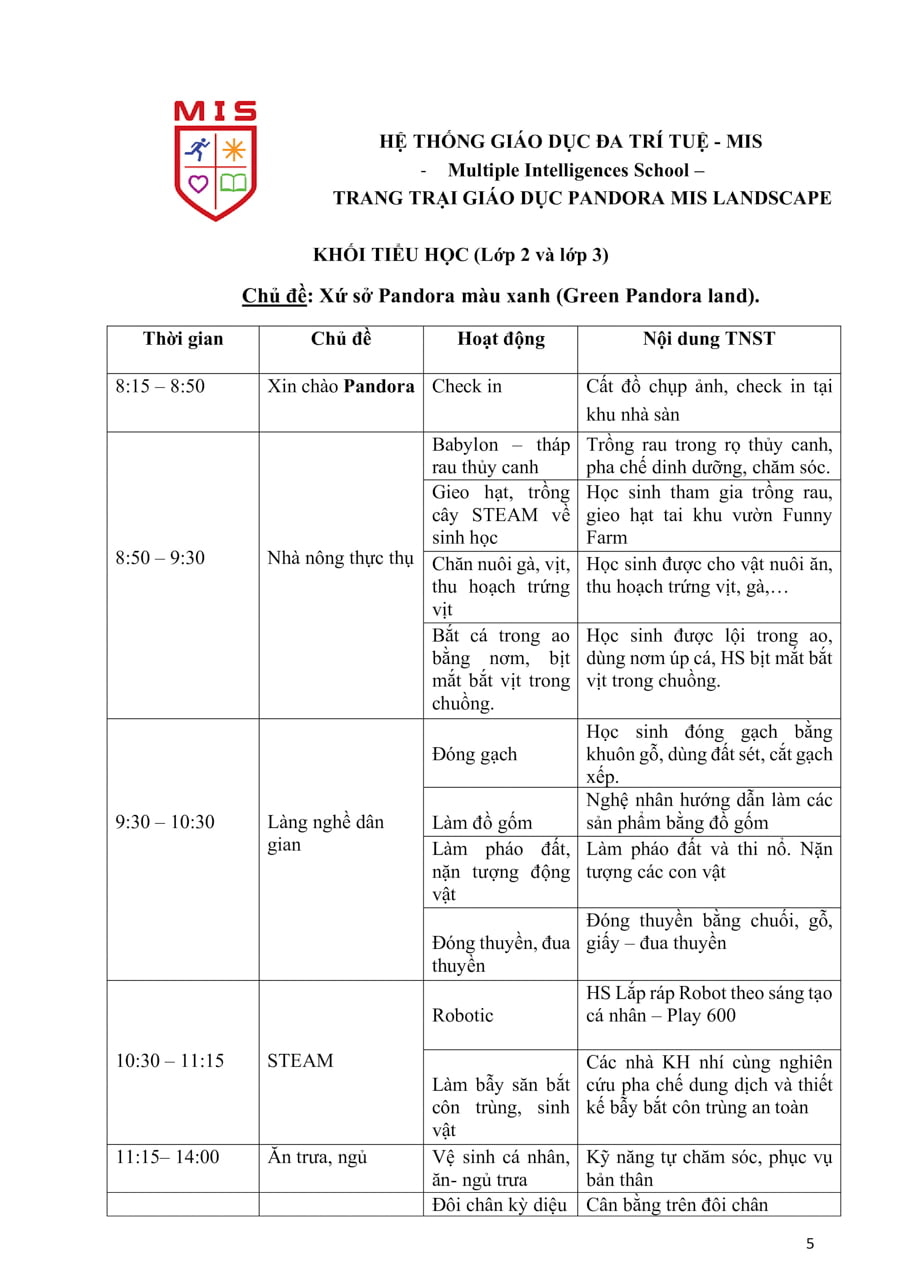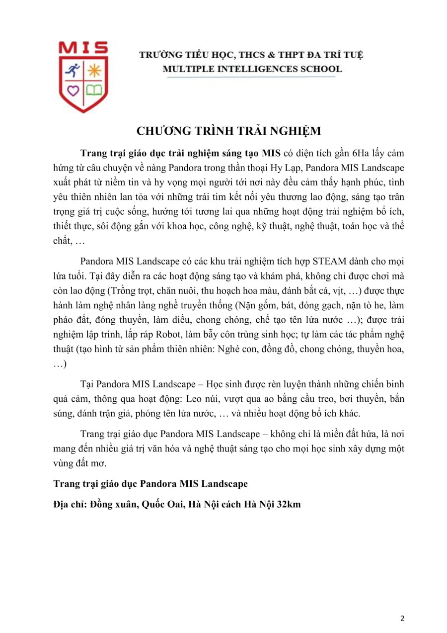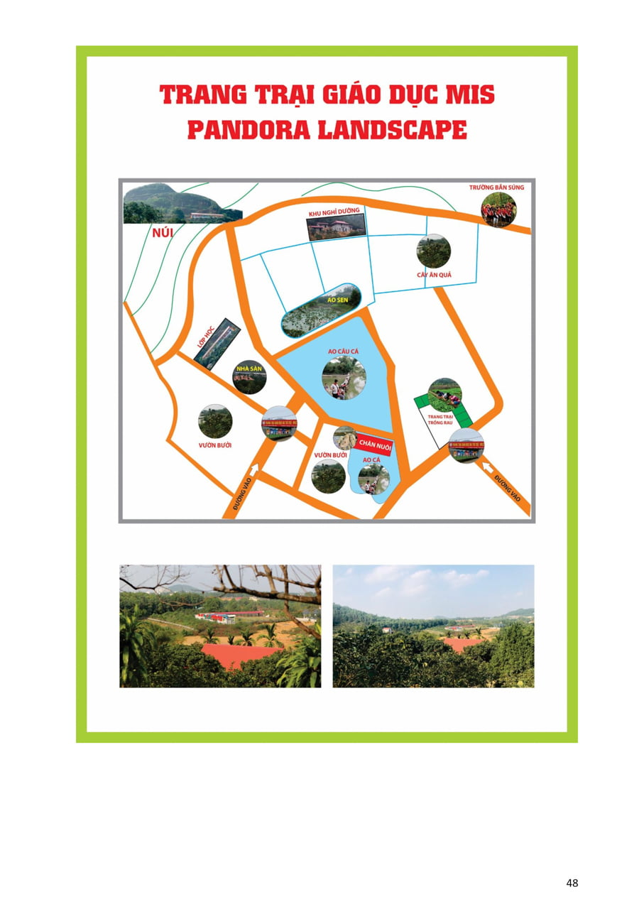 Trang trại giáo dục trải nghiệm sáng tạo MIS có diện tích gần 6Ha lấy cảm hứng từ câu chuyện về nàng Pandora trong thần thoại Hy Lạp, Pandora MIS Landscape xuất phát từ niềm tin và hy vọng mọi người tới nơi này đều cảm thấy hạnh phúc, tình yêu thiên nhiên lan tỏa với những trái tim kết nối yêu thương lao động, sáng tạo trân trọng giá trị cuộc sống, hướng tới tương lai qua những hoạt động trải nghiệm bổ ích, thiết thực, sôi động gắn với khoa học, công nghệ, kỹ thuật, nghệ thuật, toán học và thể chất, …
