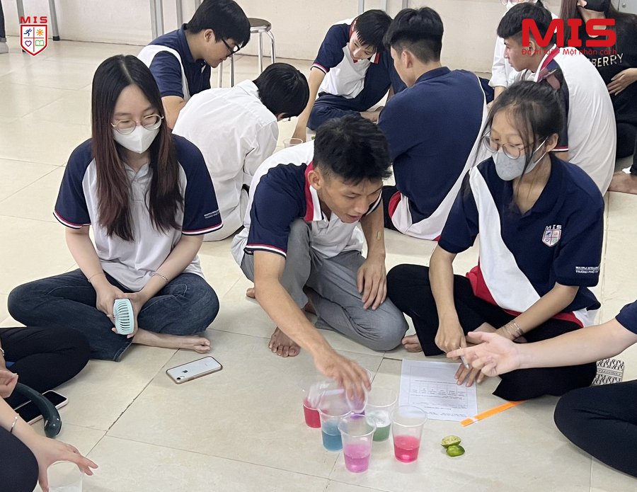 Đến với thí nghiệm chuyển màu chất chỉ thị, các con được thí nghiệm với bắp cải tím để chuyển màu chất chỉ thị. Thí nghiệm này giúp học sinh biết cách pha màu và nhận biết được axit, bazơ. Tất cả các Miser đều hứng thú và năng động khi tham gia hai hoạt động học tập này.