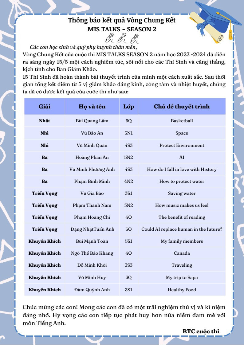 Xin chúc mừng tất cả các MISer đã đạt giải trong cuộc thi. Đây chính là thành quả của sự chăm chỉ và quyết tâm. Hy vọng rằng cuộc thi này sẽ là một bước đệm để các con tiếp tục phát triển kỹ năng tiếng Anh và tự tin hơn trong những hoạt động học tập và cuộc sống sau này.