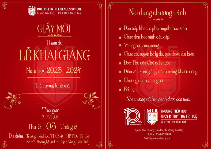 Nhà trường xin trân trọng gửi Giấy mời dự Lễ Khai giảng năm học 2023-2024 tới các vị khách quý, cha mẹ học sinh để buổi Lễ trở nên thiêng liêng và gắn kết hơn.