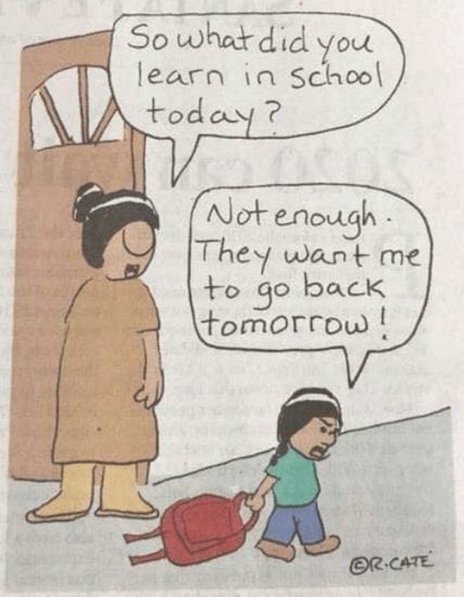 Không chỉ ở Việt Nam, tại các quốc gia Đông Nam Á khác như Philippines hay Thái Lan, tác phẩm này cũng được người dùng “chế” lại và xuất hiện tràn lan trên các trang mạng. Được biết, phiên bản gốc của bức tranh được tạo ra bởi Ricardo Caté – một họa sĩ người Mỹ bản địa (hay còn gọi là người da đỏ) nổi tiếng. Tác phẩm nằm trong loạt tranh biếm của series Without Reservations mô tả một người con đi học về và được mẹ hỏi rằng có học được gì ở trường không. Cậu bé đáp lại: “Có, nhưng vẫn không đủ. Họ muốn con quay lại vào ngày mai”.