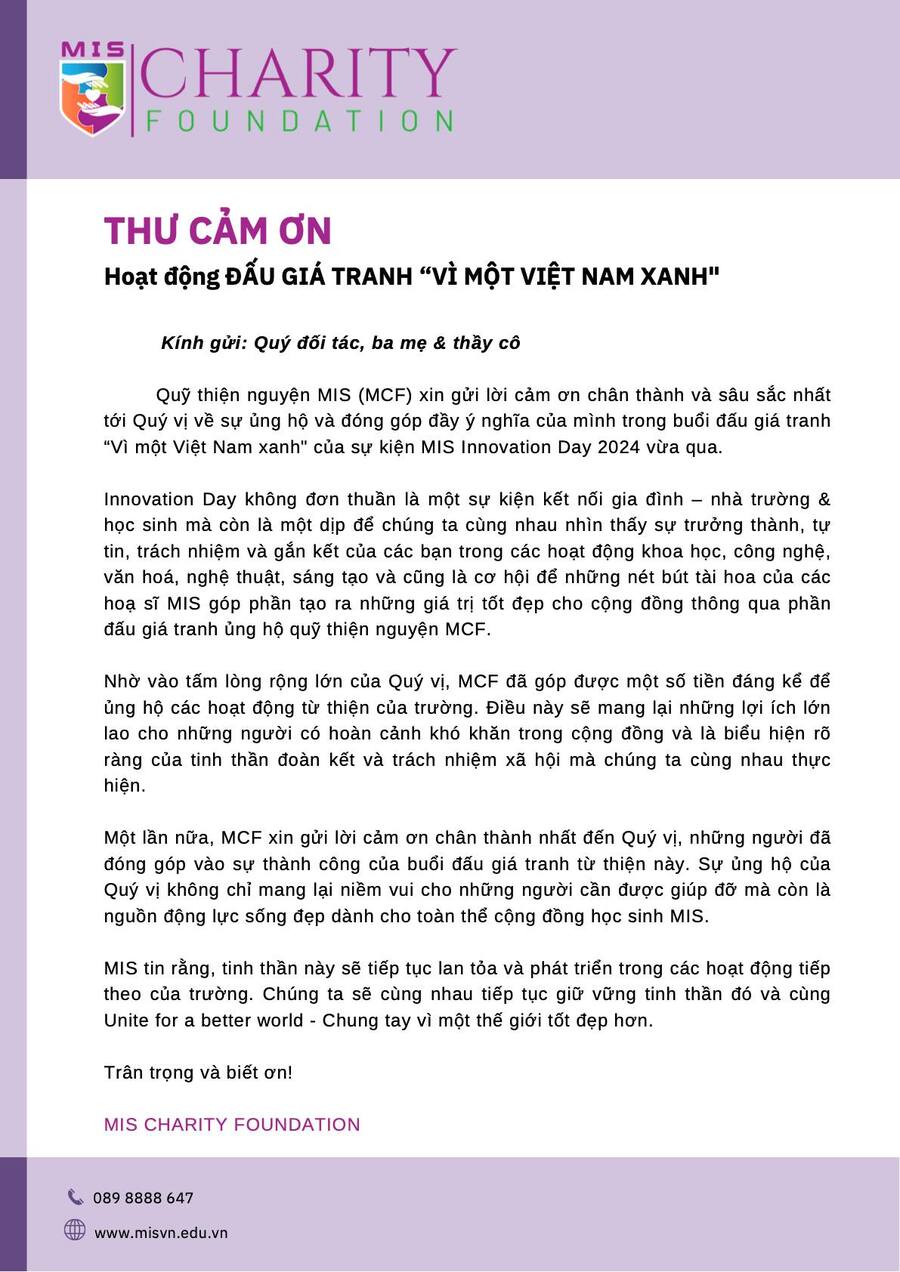 MIS xin gửi lời cảm ơn trân trọng nhất đến các Quý đối tác, Quý phụ huynh và gia đình MIS đã nhiều năm đồng hành và ủng hộ các hoạt động của nhà trường và đã chung tay làm nên một ngày hội mang lại những bài học và giá trị tinh thần cho MISers.