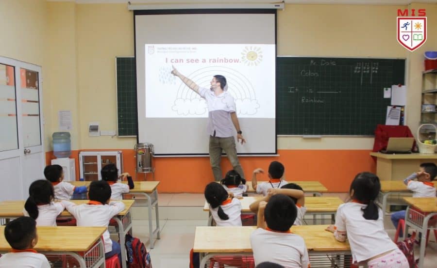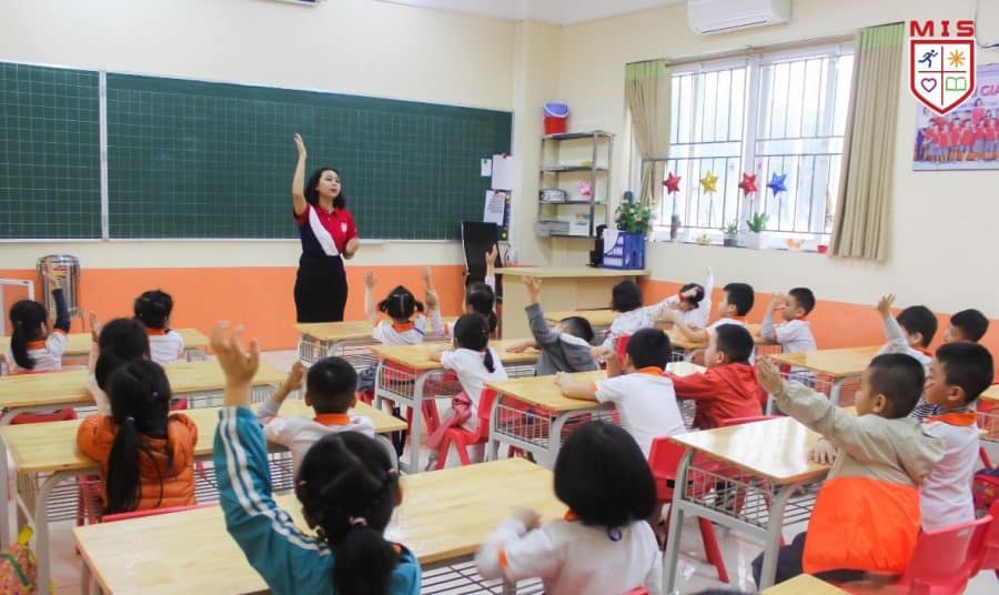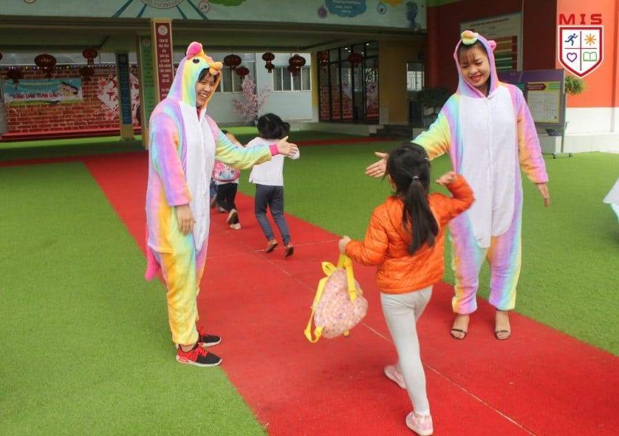 Như một dấu hiệu của sự khởi đầu tốt đẹp, các bạn nhỏ Hoa Thủy Tiên đã cùng nhau khởi động trên nền nhạc BabyShark quen thuộc, vui nhộn. Trong sự hào hứng ấy, các con được học cách chào kiểu MIS. Khi cô giáo hỏi: “Tay phải của các con đâu? Các con giơ tay phải lên thật cao nào!”, các bạn nhỏ đều đồng loạt làm theo, nhưng vẫn có cô cậu nhỏ mải ngắm cành hoa đào trên sân khấu, ngắm những cuốn truyện tranh ở thư viện ngoài trời của MIS nên chưa kịp bắt nhịp. Nhưng rồi cũng ổn thỏa. Các con còn được học, được thực hành kiểu chào này trong suốt một ngày làm MISer. Khi cánh tay phải đặt lên ngực trái, người cúi xuống kính cẩn cũng là lúc các con bày tỏ sự biết ơn, tôn trọng với thầy cô, với người đối diện.