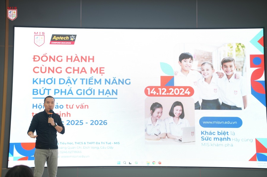Sáng hôm nay, 14/12/2024, buổi hội thảo “Đồng hành cùng ba mẹ: Khơi dậy tiềm năng – Bứt phá giới hạn” đã diễn ra và là nơi ba mẹ nhận được những lời khuyên thực tế từ các chuyên gia giáo dục đến từ MIS và Aptech về việc lựa chọn môi trường học tập phù hợp nhất, nơi khai phá và phát triển các tiềm năng trong con. Và tại đây, ba mẹ cũng đã được khám phá hành trình giáo dục toàn diện tại MIS – nơi nuôi dưỡng sự phát triển của cả tri thức, cảm xúc và kỹ năng sống.