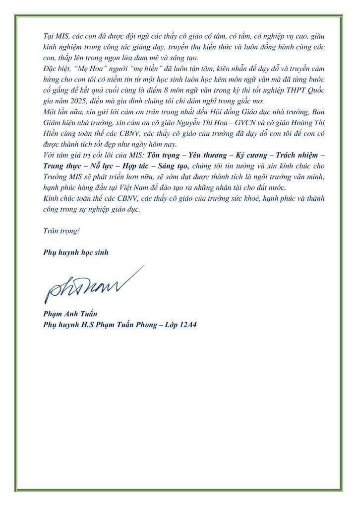 Hôm nay, khi nhận được bức thư của ba Tuấn Phong, trái tim chúng tôi thật sự rung động. Bởi lẽ, giáo dục thực sự bắt đầu từ trái tim, và chỉ khi chạm vào trái tim, nó mới trở thành hành trang trưởng thành cho mỗi đứa trẻ.