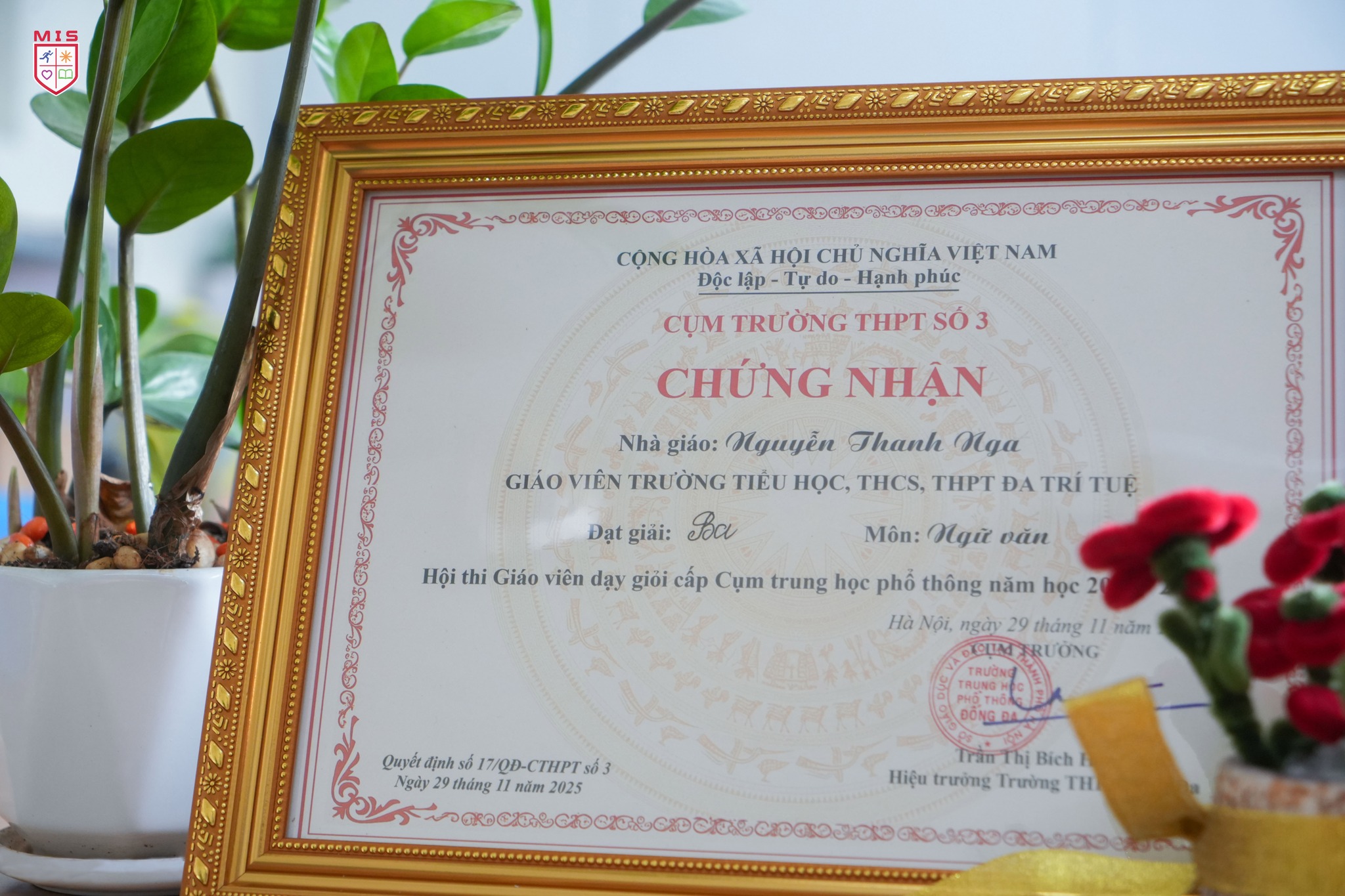 Trường Tiểu học, THCS & THPT Đa Trí Tuệ (MIS) trân trọng chúc mừng cô Nguyễn Thanh Nga đã đạt thành tích xuất sắc tại Hội thi Giáo viên dạy giỏi cấp Cụm THPT năm học 2025–2026. Đây là dấu mốc quan trọng thể hiện năng lực sư phạm vững vàng, tinh thần đổi mới và sự tận tâm của cô trong từng tiết dạy.