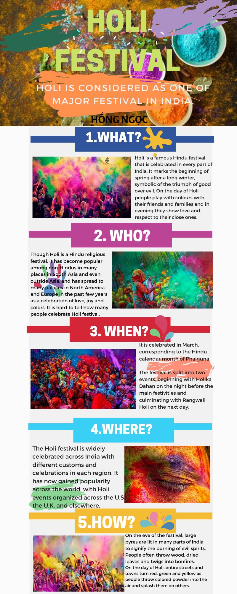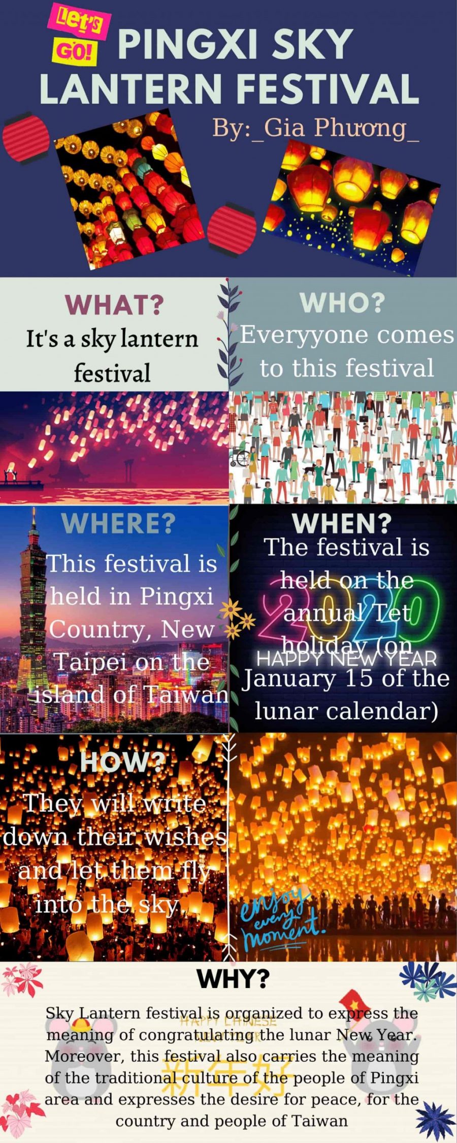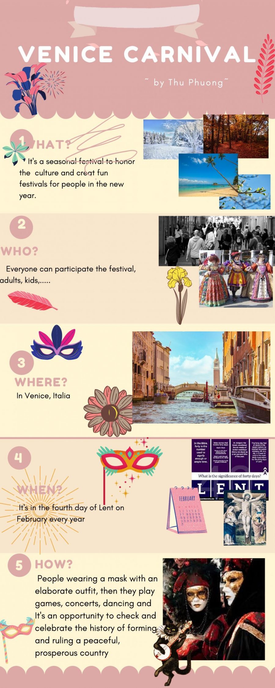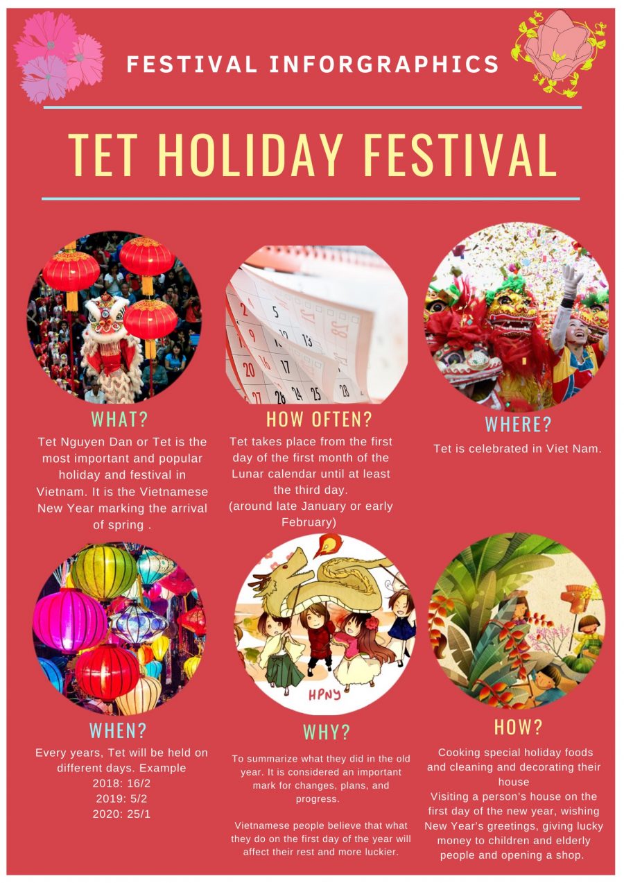 Quá trình giảng dạy trực tuyến (online) trong thời gian dịch bệnh Covid-19 hoành hành vừa qua, các thầy cô trường Đa Trí Tuệ (MIS) đều cố gắng tìm tòi các phương pháp giúp các con tiếp thu được bài học một cách tự nhiên và thoải mái, hiệu quả nhất. Cô đã thấy một số thầy cô trong trường sử dụng nhiều công cụ mới rất hay, đặc biệt là áp dụng hình thức thiết kế Infographic vào trình bày bài học. Cô cũng thấy hào hứng thích thú lắm, nhưng chưa biết nên ứng dụng bằng cách nào cho phù hợp. Rồi khi cô và trò tìm hiểu đến đơn vị bài học thứ 9 với chủ đề Festivals around the world (Lễ hội vòng quanh thế giới) trong chương trình Tiếng Anh lớp 7, hình ảnh của những tấm Infographic màu sắc về các lễ hội trên thế giới đã lóe lên. Cô quyết định: thay vì yêu cầu các con làm bài viết trong phần kỹ năng Writing trên Words hay Padlet như mọi khi, lần này sẽ để các con tự tìm hiểu về những lễ hội các con thích trên thế giới và trình bày thông tin dưới dạng Infographic.