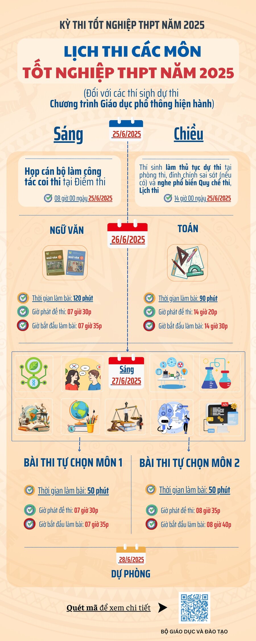 Theo đó, Kỳ thi tốt nghiệp THPT năm 2025 được tổ chức vào các ngày 25, 26, 27, 28/6/2025. Trong đó: Ngày 25/6/2025 làm thủ tục dự thi; ngày 26, 27/6/2025 tổ chức coi thi; ngày 28/6/2025 dự phòng.