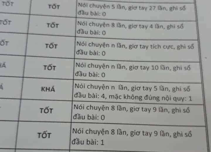 Một bản thống kê được phát tới phụ huynh ghi cu tỉ, cụ tỉ từng ngày: Con nói chuyện 8 lần, giơ tay 9 lần, ghi sổ đầu bài 1. Hay một ngày khác: nói chuyện n lần, giơ tay 5 lần, ghi sổ đầu bài 4 lần, mặc không đúng nội quy 1 lần. Hay một ngày khác nữa, nói chuyện 5 lần, giơ tay 27 lần, ghi sổ đầu bài 0 lần. Nếu các bạn không tin, có thể xem ảnh minh họa.