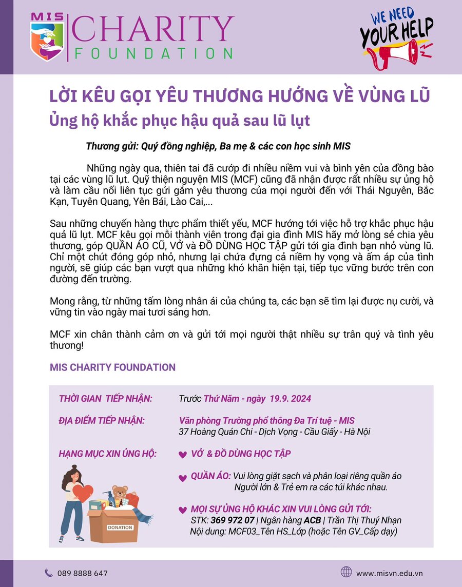 Và hướng tới việc hỗ trợ khắc phục hậu quả lũ lụt, MCF kêu gọi mỗi thành viên trong đại gia đình MIS hãy mở lòng sẻ chia yêu thương, góp QUẦN ÁO CŨ, VỞ và ĐỒ DÙNG HỌC TẬP gửi tới gia đình bạn nhỏ vùng lũ. Chỉ một chút đóng góp nhỏ, nhưng lại chứa đựng cả niềm hy vọng và ấm áp của tình người, sẽ giúp các bạn vượt qua những khó khăn hiện tại, tiếp tục vững bước trên con đường đến trường.