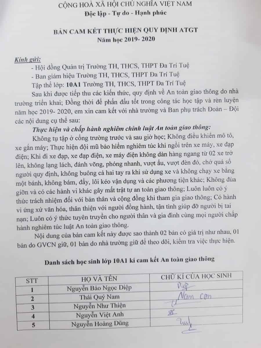 Bản Cam kết An toàn giao thông của học sinh MIS