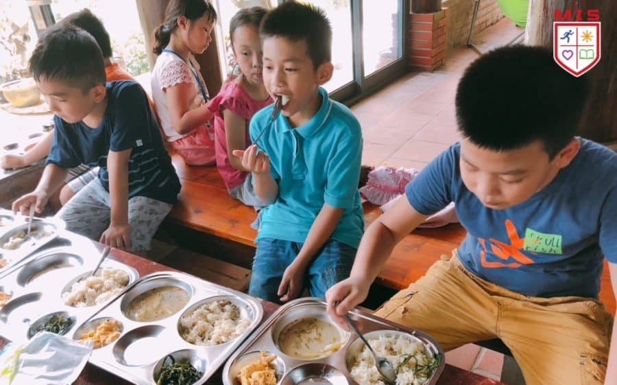 Sau buổi sáng tích cực vận động cơ thể, các bạn thưởng thức bữa trưa vô cùng ngon miệng. Không chờ thầy cô nhắc nhở, không làm nũng biếng ăn, bạn nào cũng tự xúc những thìa cơm thật đầy và không bỏ thừa thức ăn.