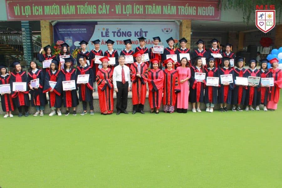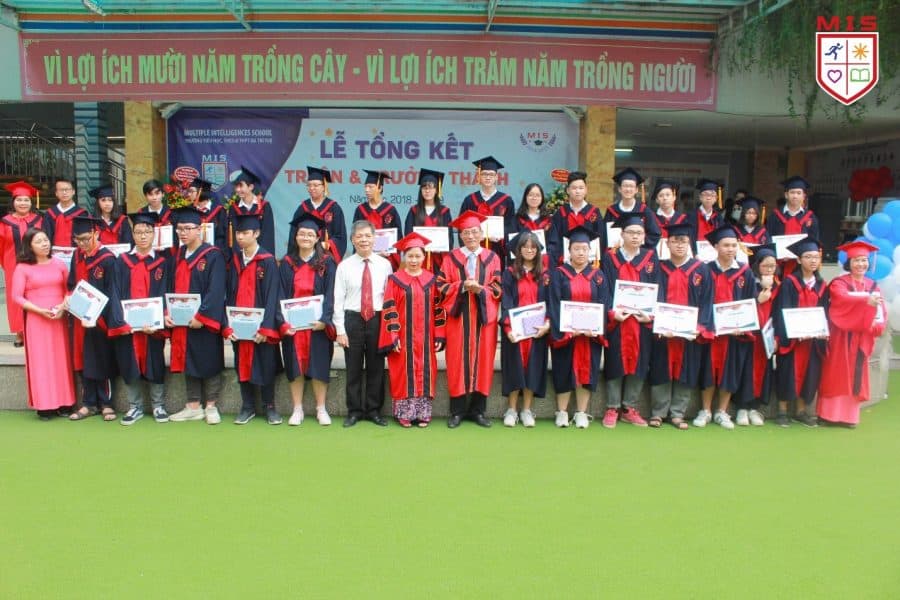 Ảnh học sinh, giáo viên khối lớp 9 cùng Ban Lãnh đạo trường MIS trong Lễ tổng kết năm học 2018 – 2019: