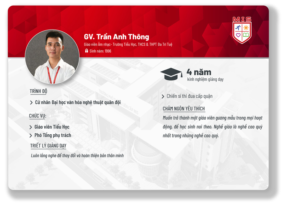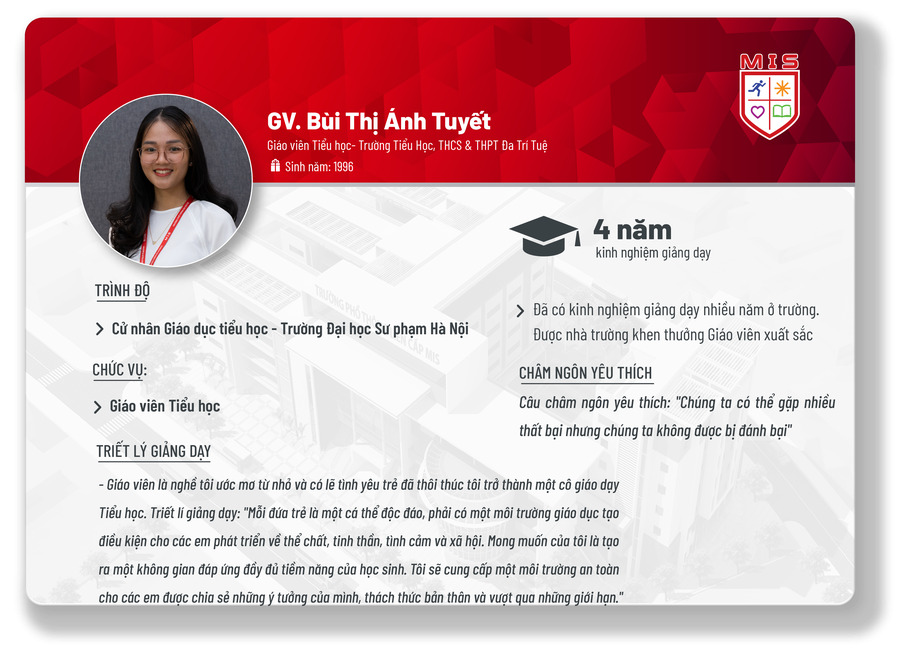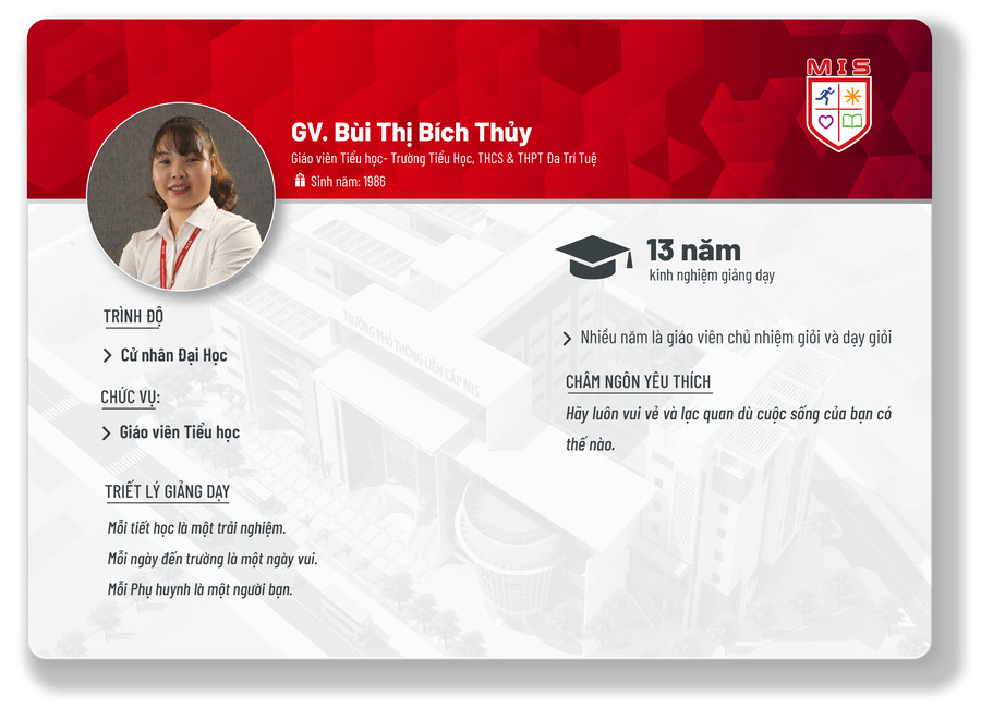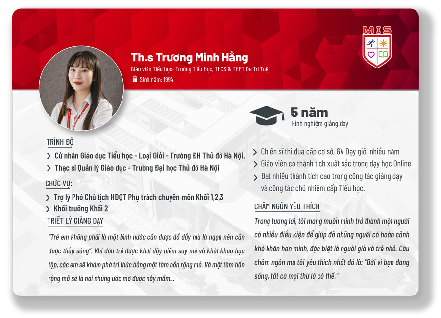 Trường PTLC Đa Trí Tuệ MIS chân thành cảm ơn các nhà giáo đồng hành cùng Tiểu học MIS và xin trân trọng giới thiệu tới học sinh và phụ huynh học sinh: