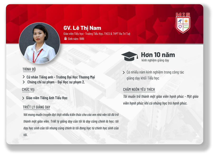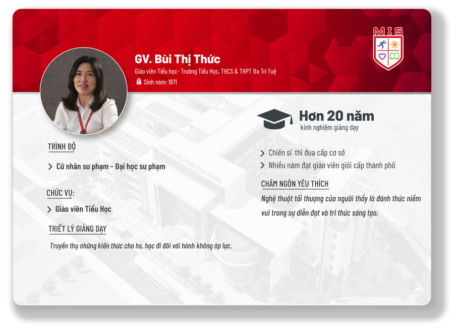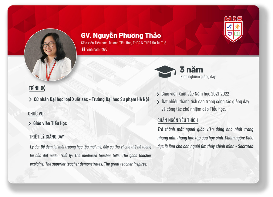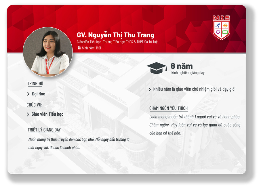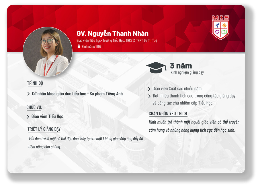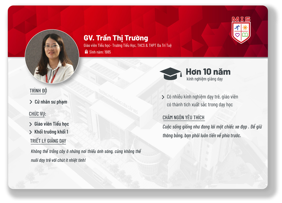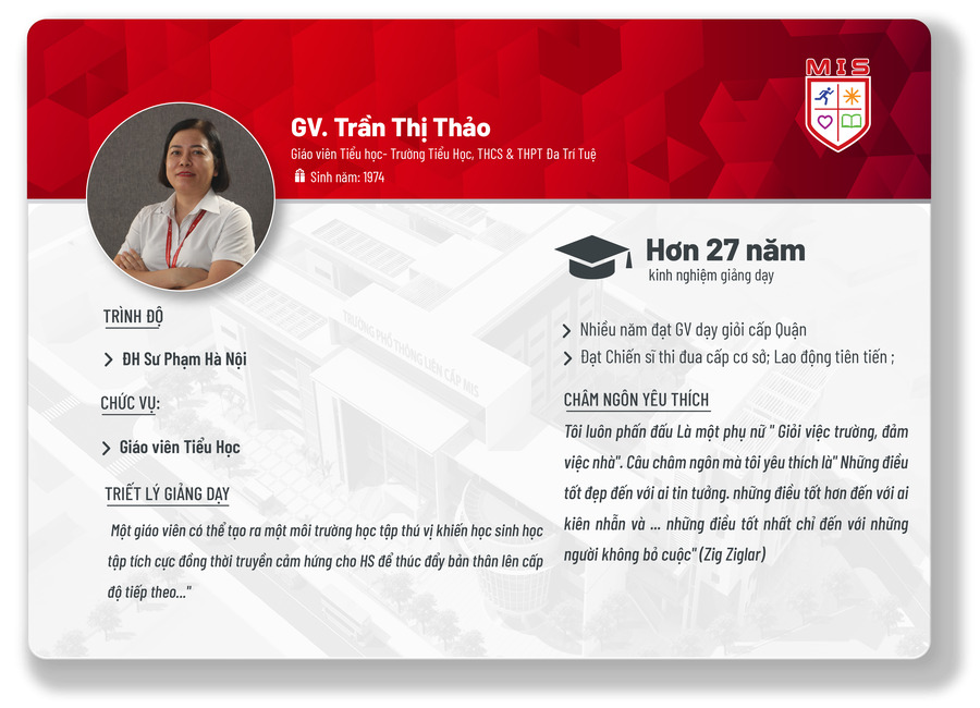 Trường PTLC Đa Trí Tuệ MIS chân thành cảm ơn các nhà giáo đồng hành cùng Tiểu học MIS và xin trân trọng giới thiệu tới học sinh và phụ huynh học sinh: