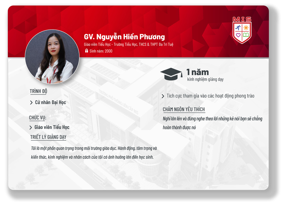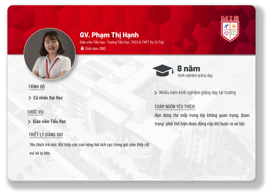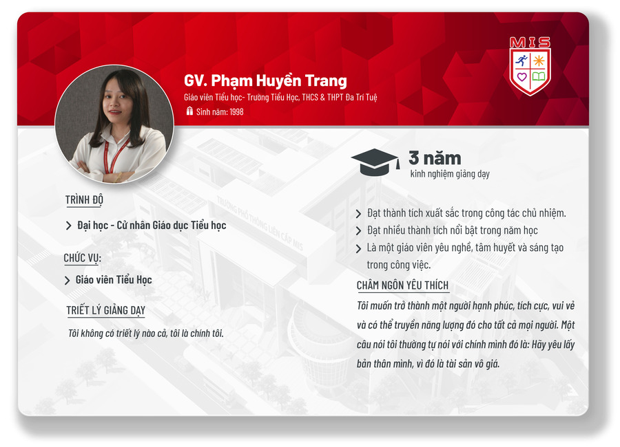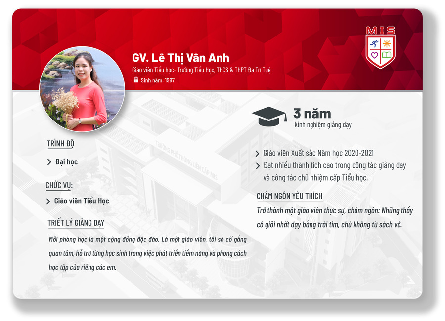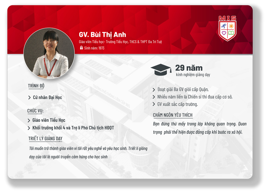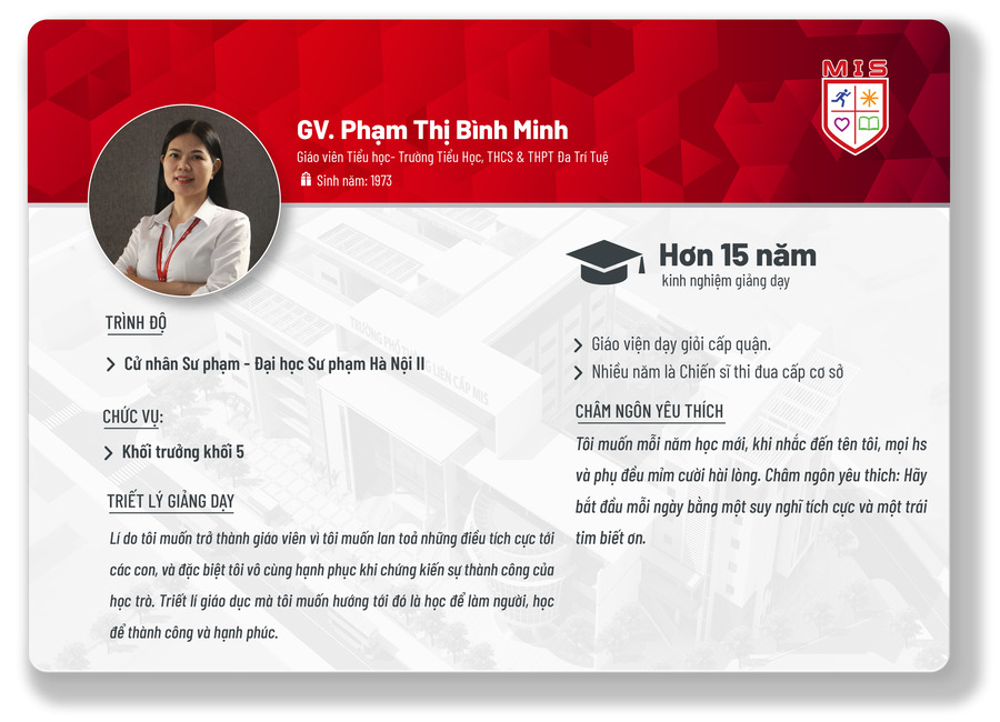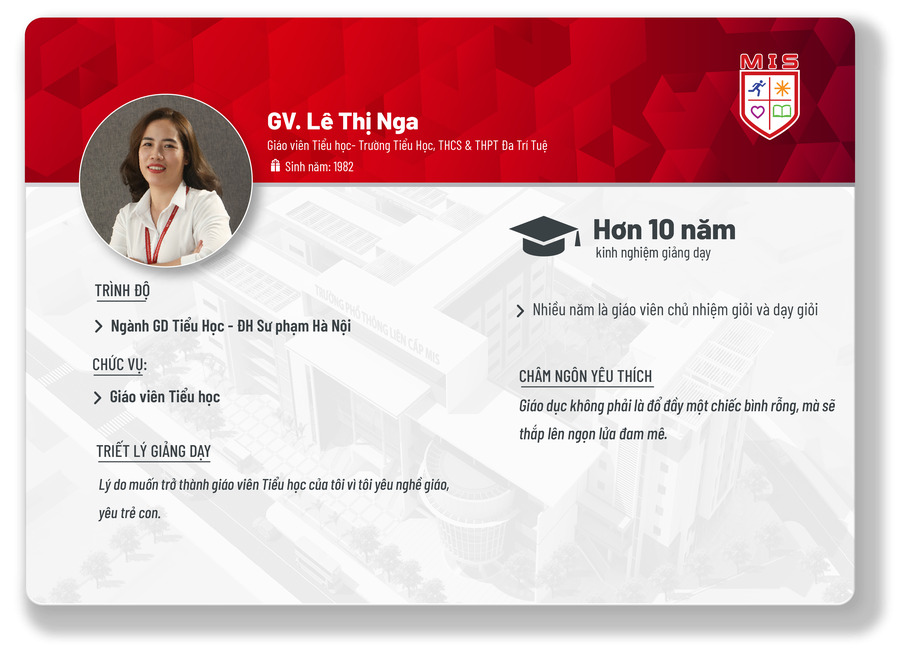 Trường PTLC Đa Trí Tuệ MIS chân thành cảm ơn các nhà giáo đồng hành cùng Tiểu học MIS và xin trân trọng giới thiệu tới học sinh và phụ huynh học sinh: