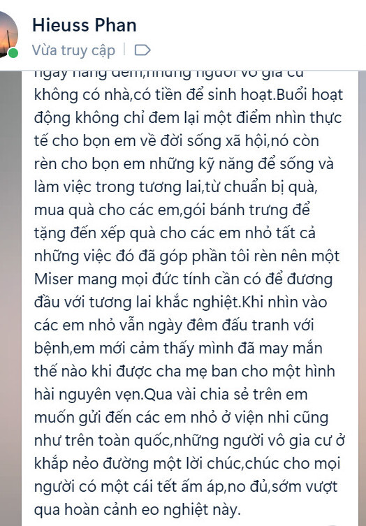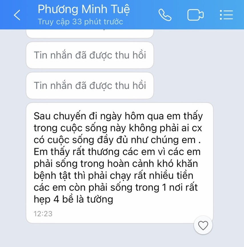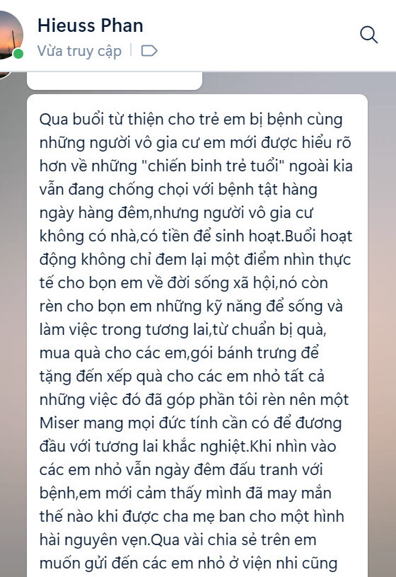 Con đã tự nhủ với bản thân là mình quá may mắn khi còn có được một cơ thể lành lặn, một sức khoẻ tốt thì hãy nên biết quý trọng cuộc sống mà mình đang có. Đến đây mới thấy thương các em biết nhường nào. Rất mong sẽ có dịp được quay trở lại thăm các em.”