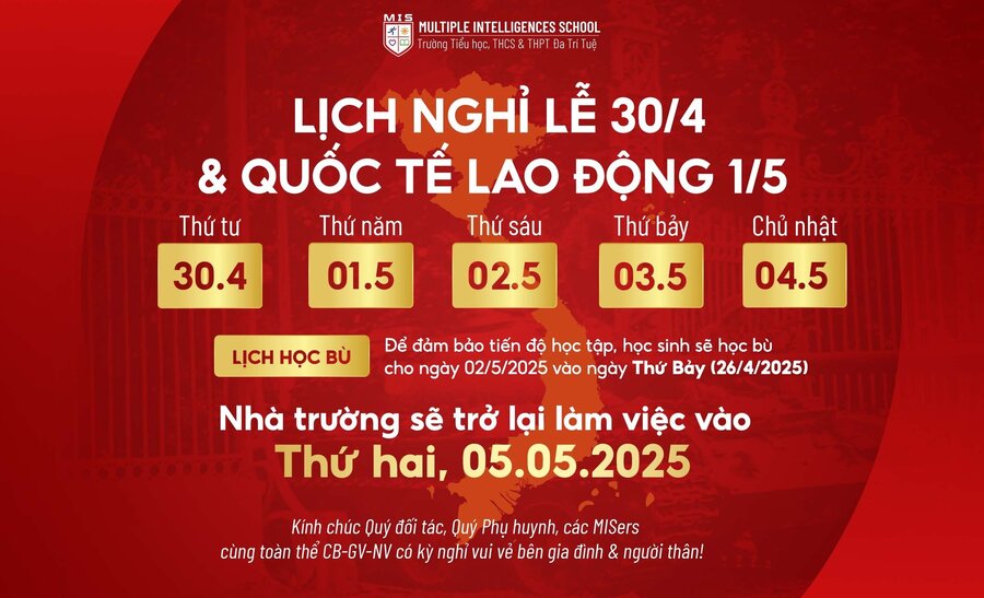 Nhân dịp Ngày Giải phóng miền Nam (30/4) và Quốc tế Lao động (1/5), Nhà trường xin thông báo lịch nghỉ lễ như sau: