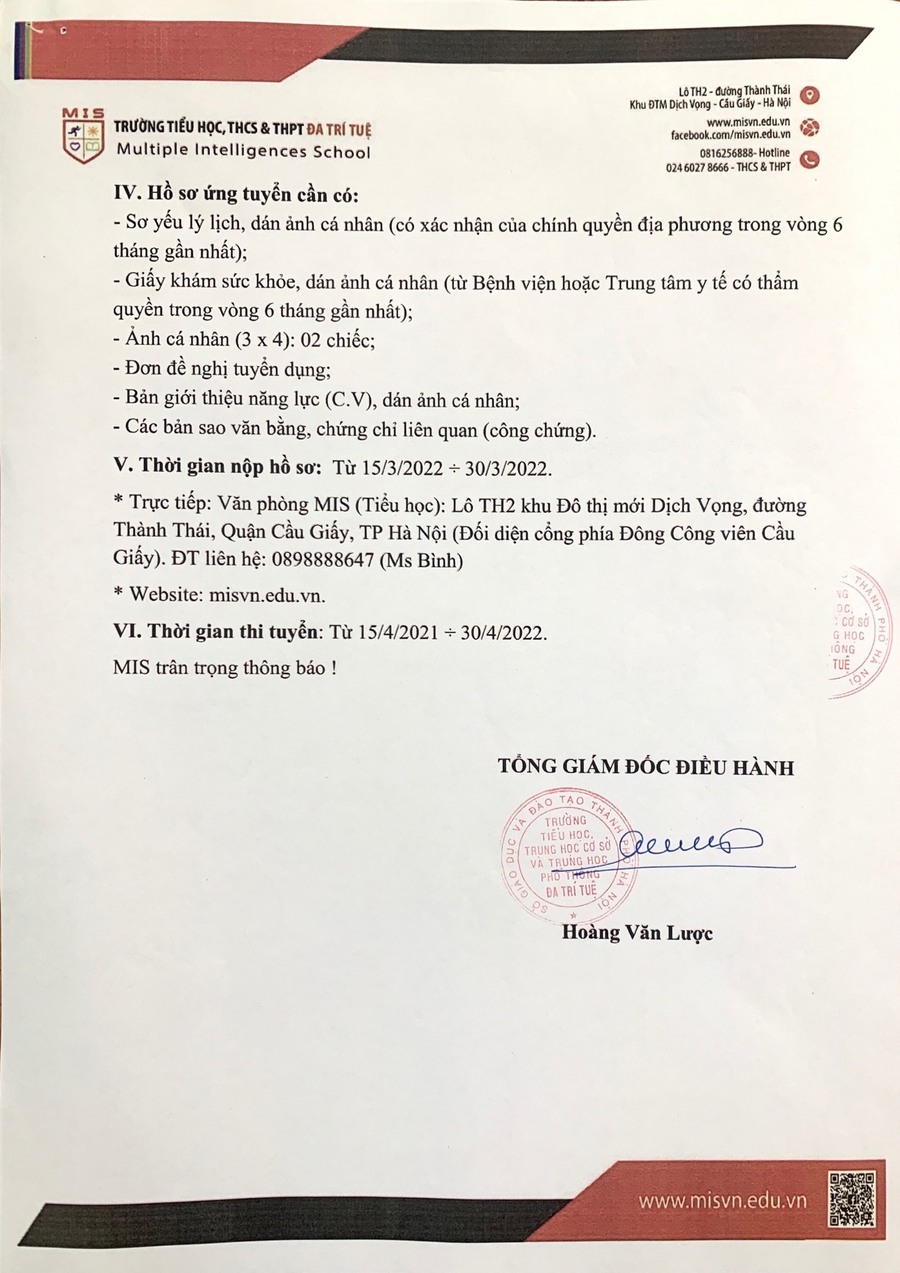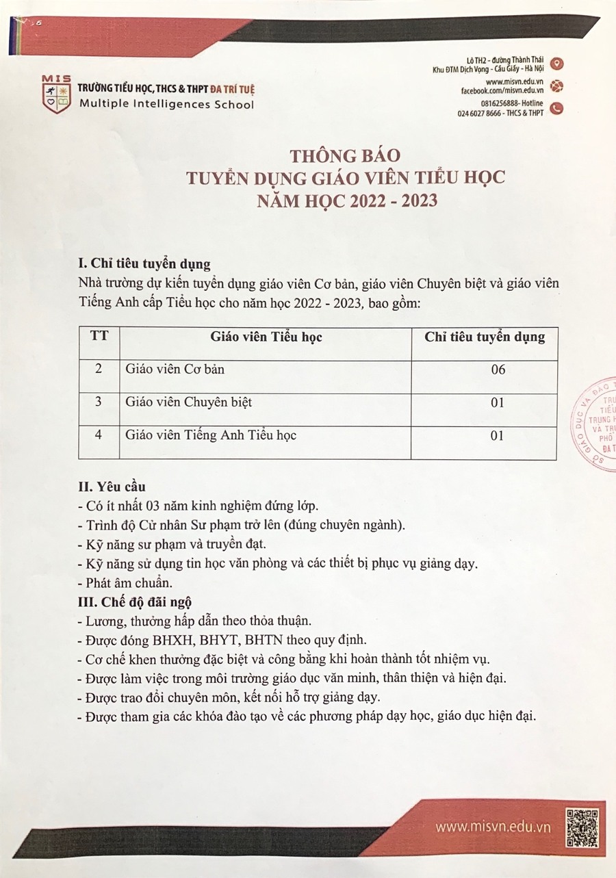 THÔNG BÁO TUYỂN DỤNG GIÁO VIÊN NĂM HỌC 2022-2023