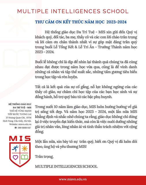 Kính gửi Quý vị khách quý, Quý đối tác, Quý cha mẹ học sinh, thầy cô và MISers Thư cảm ơn của Hệ thống giáo dục MIS.