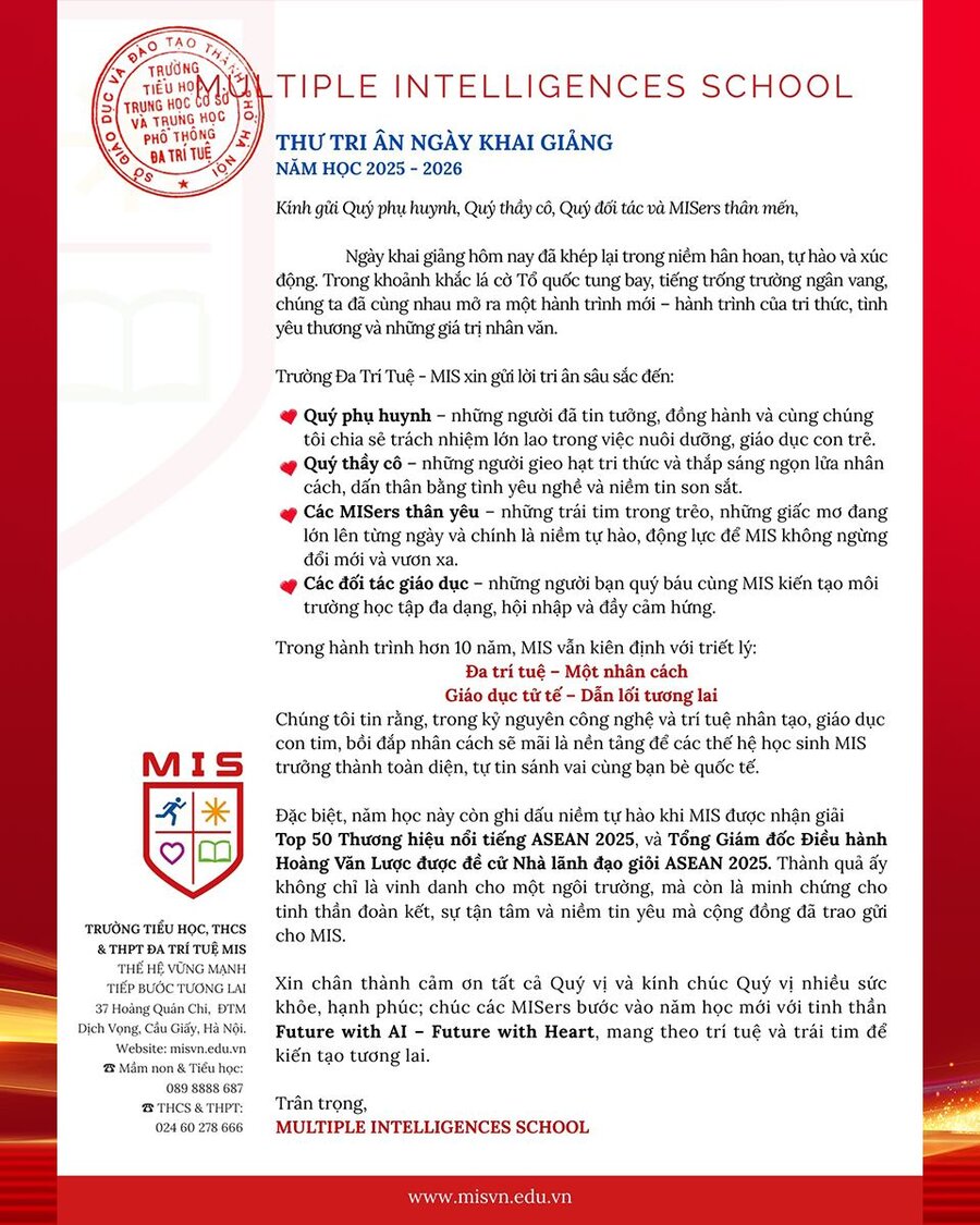 Chính nhờ sự đồng hành, tin tưởng và sẻ chia, MIS có thêm sức mạnh để tiếp tục hành trình giáo dục tử tế, nuôi dưỡng nhân cách và trí tuệ, để mỗi học sinh không chỉ học để biết, mà còn học để làm người, học để yêu thương và học để phụng sự.
