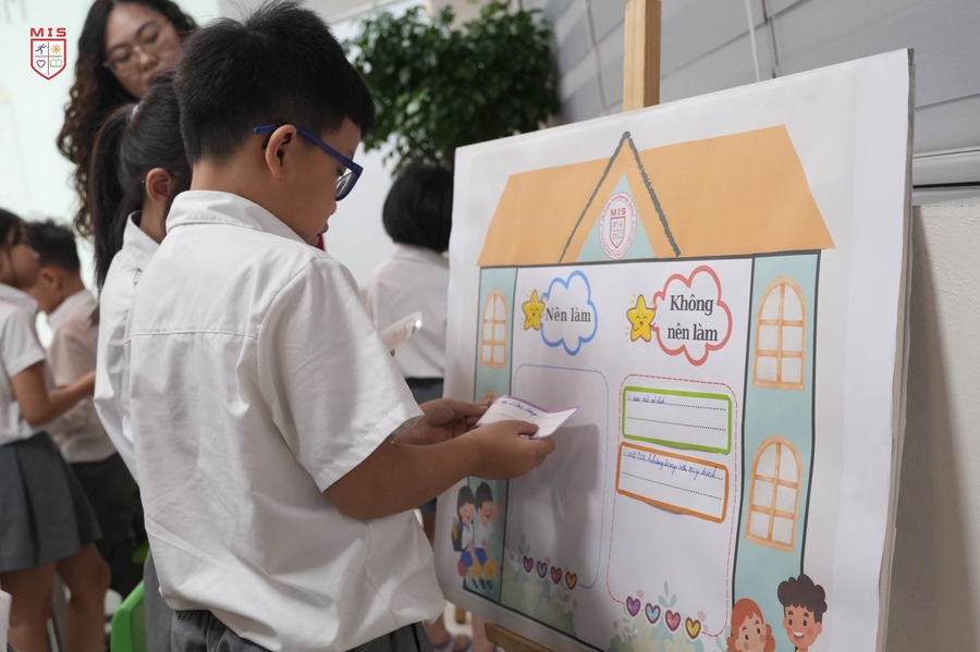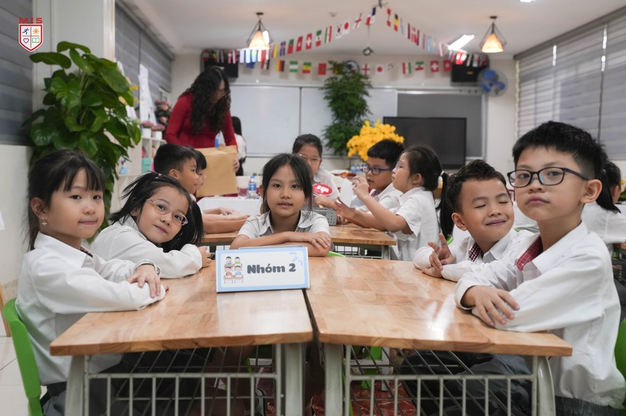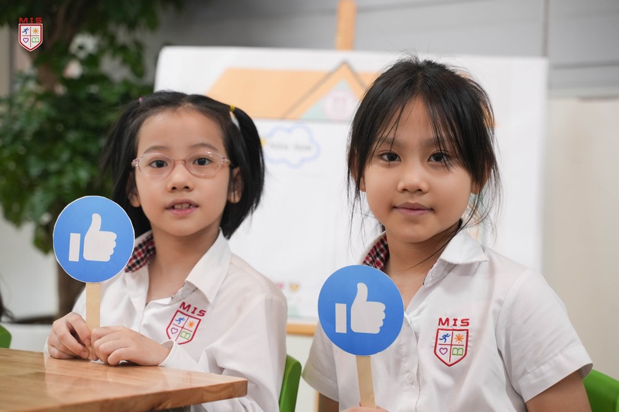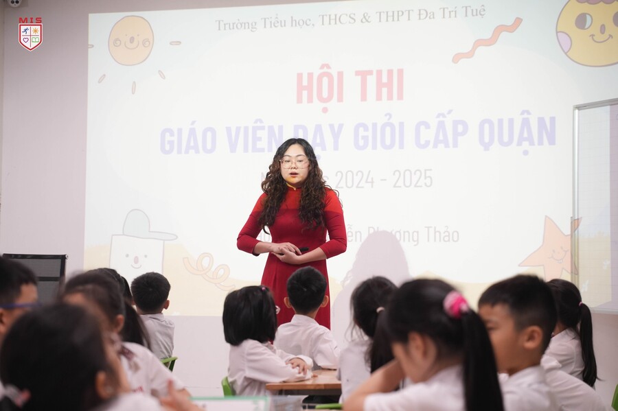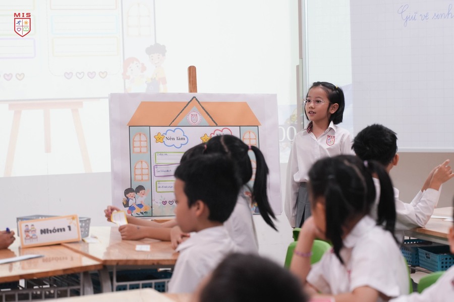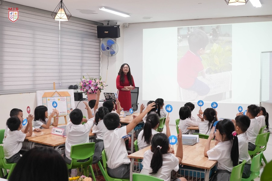 Hội đồng giám khảo đánh giá cao khả năng kết nối bài giảng với thực tiễn của cô Phương Thảo, giúp học sinh lớp 2 dễ dàng hiểu và vận dụng kiến thức. Từ những hoạt động trực quan sinh động, học sinh MIS được truyền cảm hứng mạnh mẽ, xây dựng nền tảng ý thức trách nhiệm trong việc giữ gìn vệ sinh và bảo vệ môi trường lớp học.