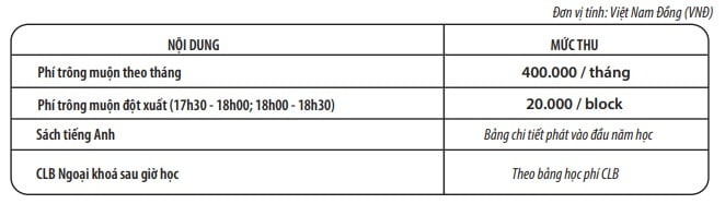 - Trong trường hợp phụ huynh đón con từ 18h30-19h00, vui lòng báo trước 16h00 cùng ngày và phí là 80.000 vnd/ block.