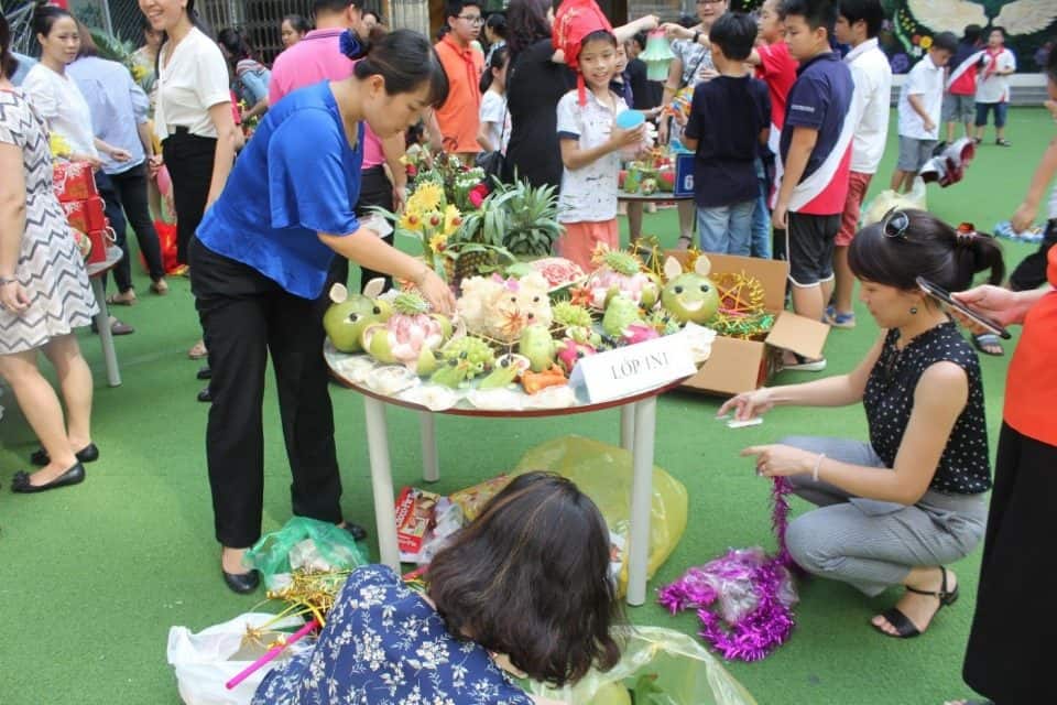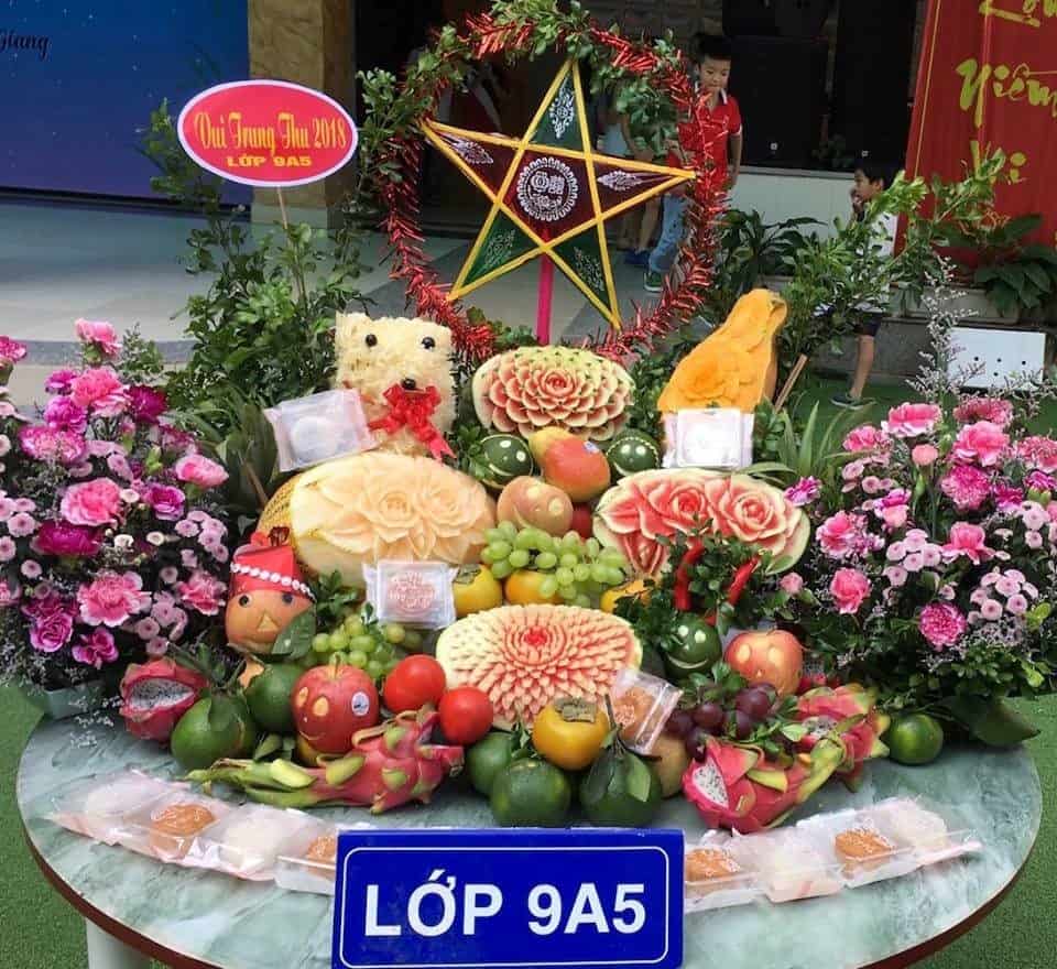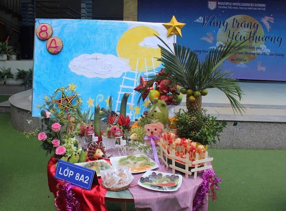 Dưới bàn tay khéo léo của các thầy cô giáo cùng các bậc phụ huynh, 29 tập thể lớp là 29 mâm cỗ trung thu tràn đầy màu sắc rực rỡ như những bức tranh ẩm thực được trang trí vô cùng bắt mắt và độc đáo.