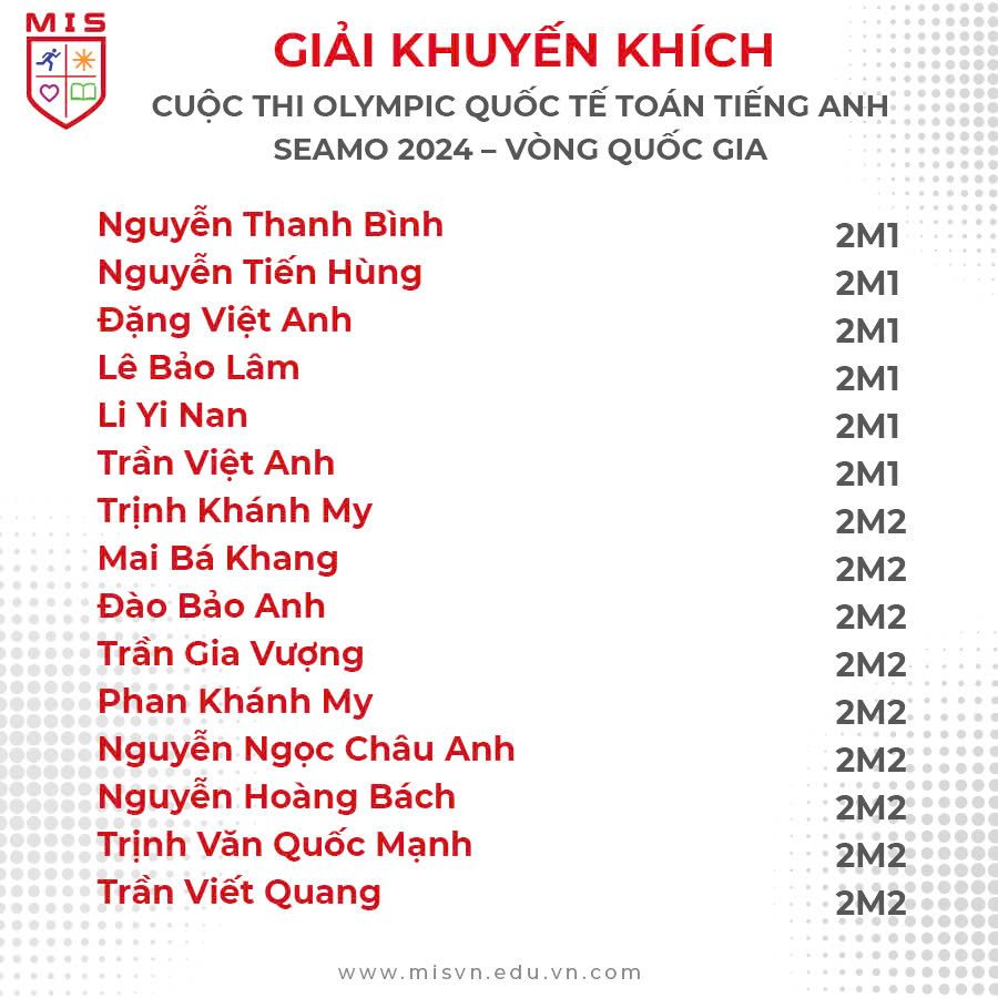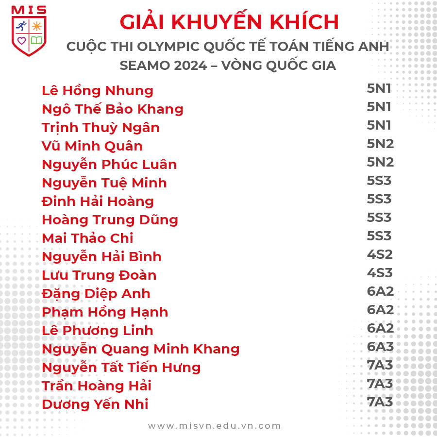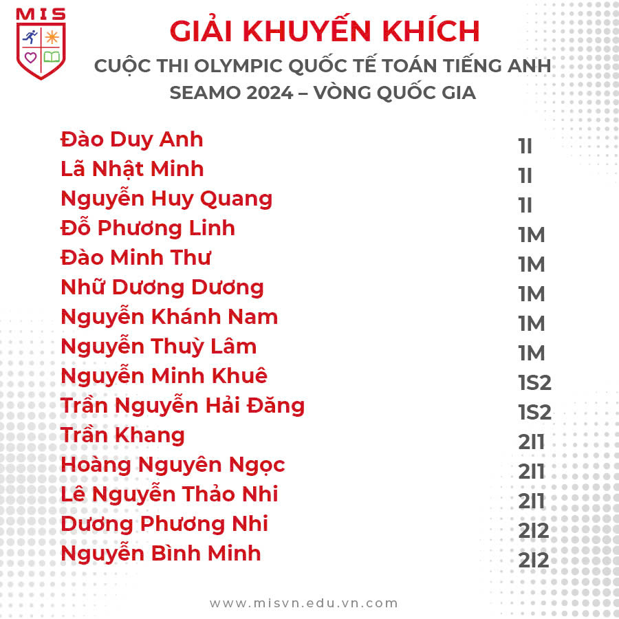 MIS xin chúc mừng 71 bạn học sinh khối Tiểu học & THCS đã xuất sắc đạt được thành tích cao tại Vòng Quốc gia kỳ thi Olympic Quốc tế Toán Tiếng Anh SEAMO 2024!