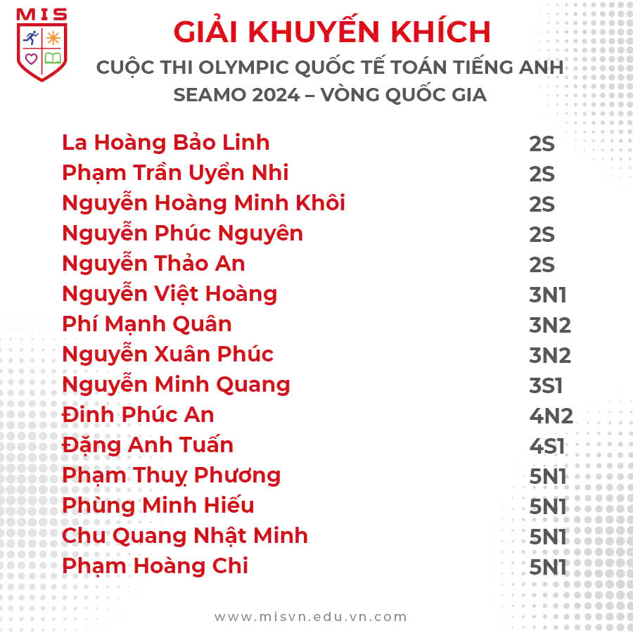 MIS xin chúc mừng 71 bạn học sinh khối Tiểu học & THCS đã xuất sắc đạt được thành tích cao tại Vòng Quốc gia kỳ thi Olympic Quốc tế Toán Tiếng Anh SEAMO 2024!