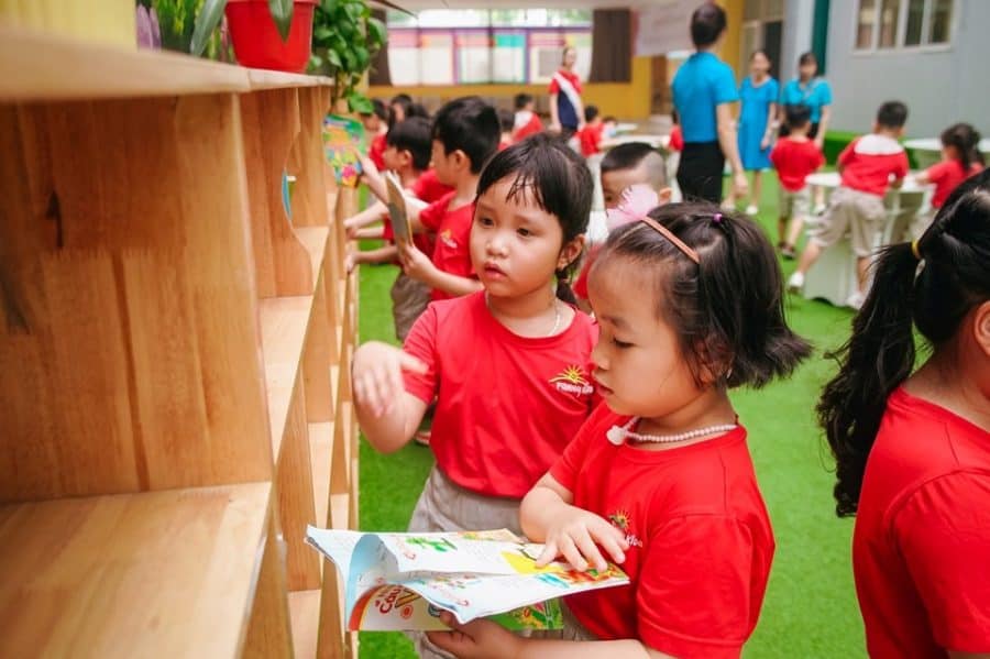 Các bạn nhỏ được tham quan sân chơi Tiểu học và đọc sách ở thư viện ngoài trời. Bạn nào cũng nhanh tay tìm cho mình một cuốn sách ưng ý trên giá. Nào là truyện về nàng Bạch Tuyết xinh đẹp, truyện về ba chú lợn con cùng sói già gian ác, truyện về cuộc phiêu lưu kì lạ của cô bé Alice ở xứ sở thần tiên… Các bạn ngồi theo từng nhóm nhỏ và chỉ cho nhau xem những hình ảnh đẹp mắt trong sách. Xem xong, các bạn tự giác xếp gọn sách vào tủ rồi mới rời đi. Thật đáng khen!