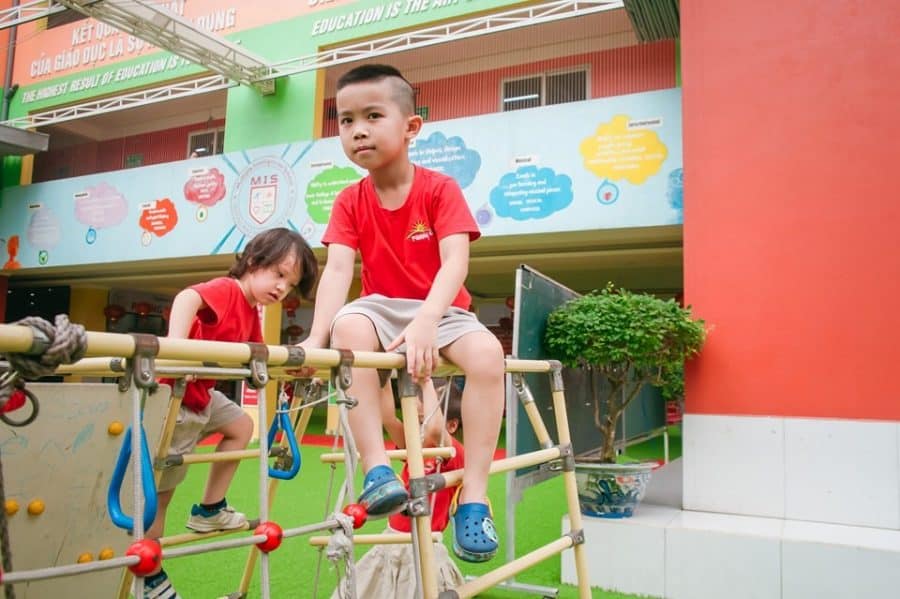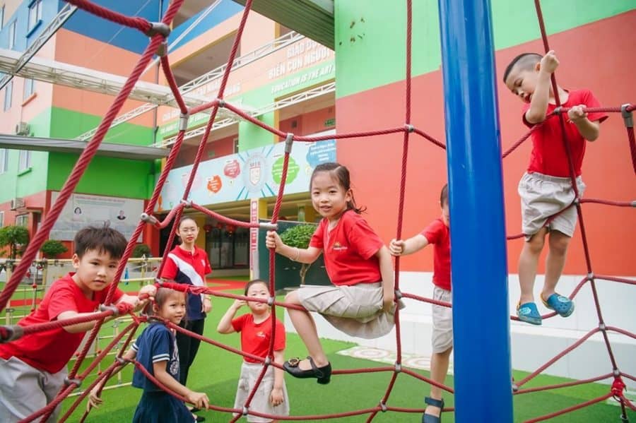 Khi tiếng trống ra chơi vang lên, các bạn nhỏ cùng nhau xuống sân và tham gia nhiều trò chơi thú vị. Bạn nào thích nhẹ nhàng, thơ mộng thì ngồi xích đu. Có bạn cá tính hơn thì trở thành nghệ sĩ giữ thăng bằng với trò cầu nhựa trên không… Có bạn lại thể hiện sự khéo léo và sức bền của mình với xà đu vận động. Vận động thể chất với đồ chơi ngoài trời là phương pháp giải trí mang lại nhiều hiệu quả: tăng cường hệ thống miễn dịch, giúp các con kiểm soát hành vi của bản thân, phát triển kỹ năng sống và vượt lên những giới hạn của chính mình.