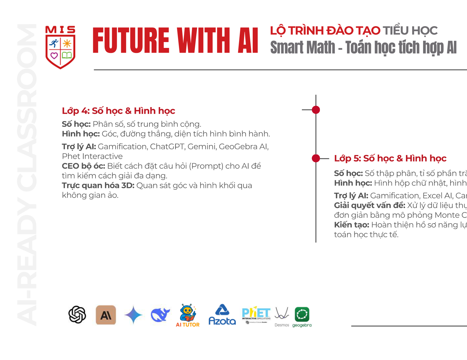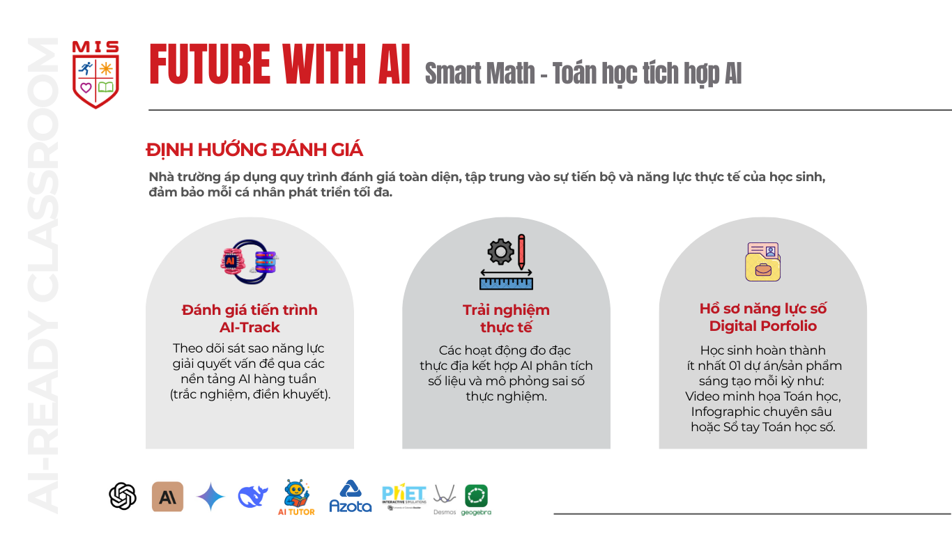 Một tiết học Toán tại MIS không có sự nhàm chán. Tiết học được thiết kế năng động theo chu trình: Khởi động nhận thức → Khám phá công nghệ → Luyện tập tư duy → Giao bài cá nhân hóa.
