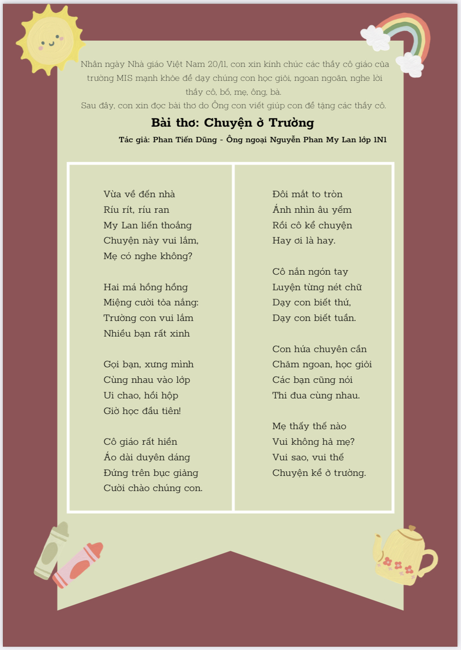 Tôi tin rằng ở MIS, con tôi nói riêng và những đứa trẻ nói chung sẽ có được TAM BẢO của mình – BẠN TỐT – THẦY GIỎI – SÁCH HAY. Bởi tôi thấy cái tâm của MIS, của thầy cô trong niềm vui của con mỗi ngày, để con lớn lên THÔNG MINH và HẠNH PHÚC!…