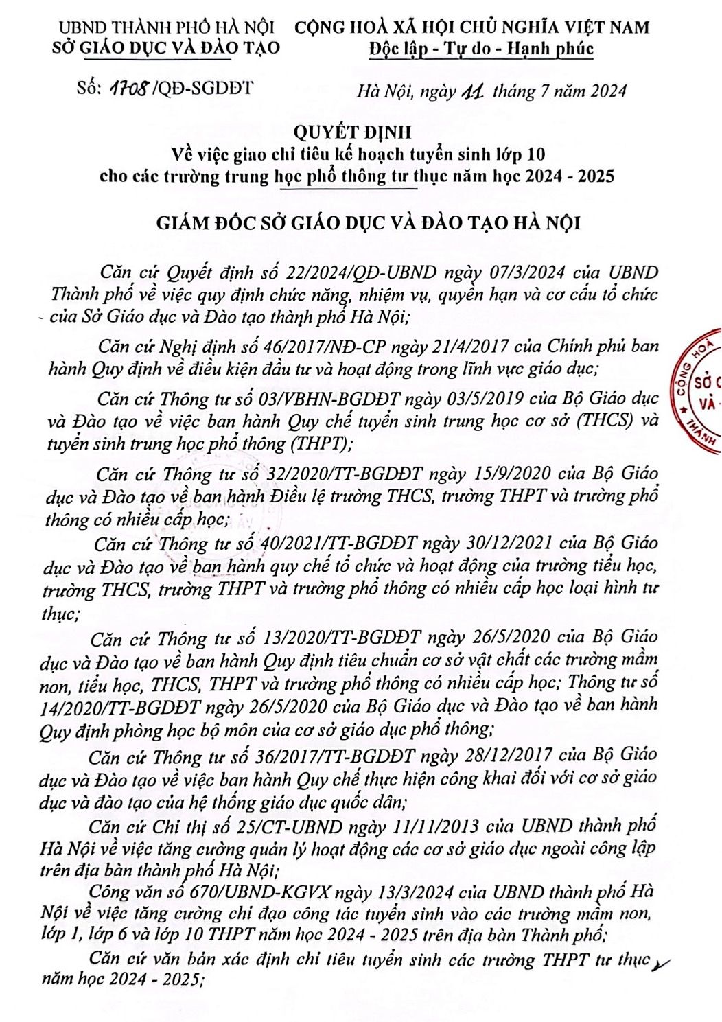 Nhà trường trân trọng thông báo “QUYẾT ĐỊNH về việc giao chỉ tiêu kế hoạch tuyển sinh vào lớp 10 MIS” năm học 2024 – 2025 của Sở Giáo dục và Đào tạo thành phố Hà Nội.
