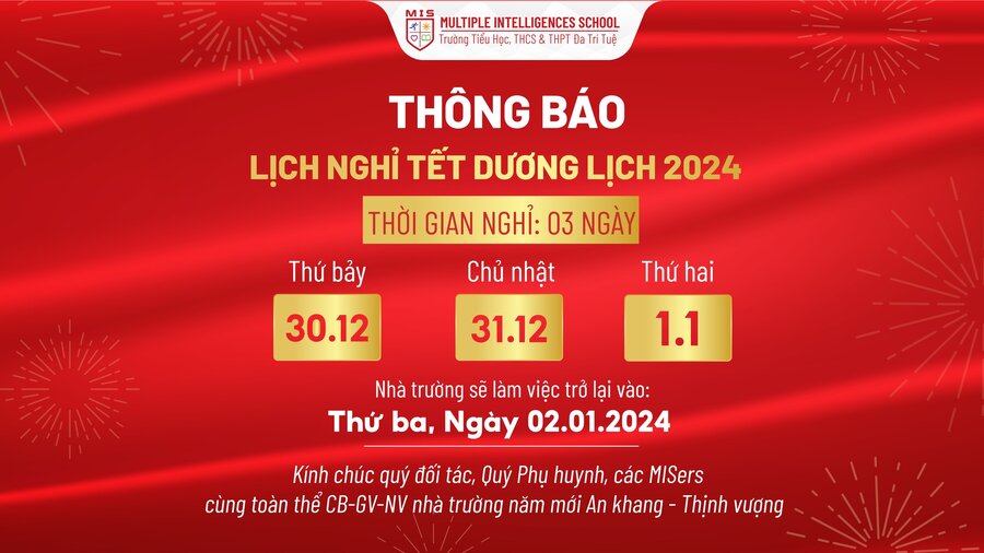 Kính chúc Quý đối tác, Quý Phụ huynh, các MISers cùng toàn thể Cán bộ, giáo viên, nhân viên đang công tác và làm việc tại MIS sẽ có một kỳ nghỉ lễ vui vẻ, hạnh phúc bên người thân và gia đình!