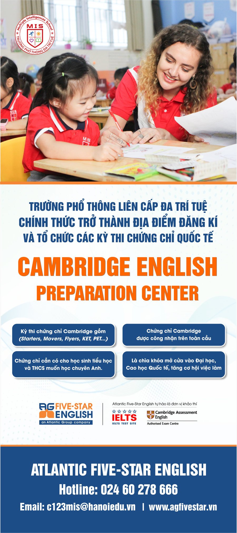 Được sự cho phép của Sở Giáo dục và Đào tạo Hà Nội, Công ty CP Atlantic Five-Star English trân trọng gửi tới Quý phụ huynh thông tin về các kì thi Khảo thí Cambridge tại trường Phổ thông Đa Trí Tuệ (MIS) như sau: