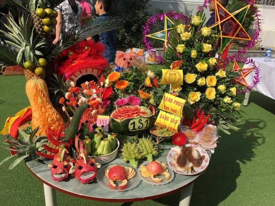 Dưới bàn tay khéo léo của các thầy cô giáo cùng các bậc phụ huynh, 29 tập thể lớp là 29 mâm cỗ trung thu tràn đầy màu sắc rực rỡ như những bức tranh ẩm thực được trang trí vô cùng bắt mắt và độc đáo.